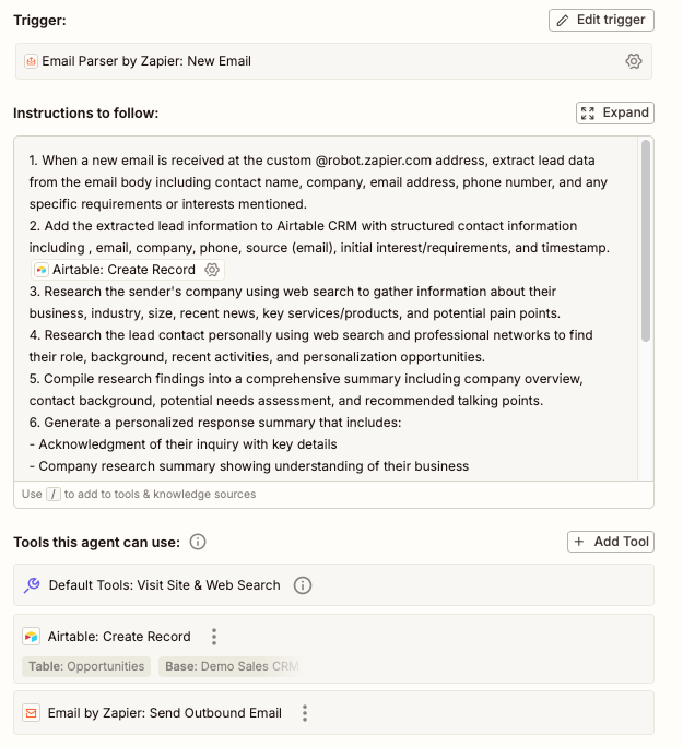 For example, you could email an AI agent the contact information for a new lead. The agent could add the lead to your CRM, research the lead, then reply with a concise summary and a draft email for you to review and send. That is exactly what the agent shown below (built in Zapier) does.