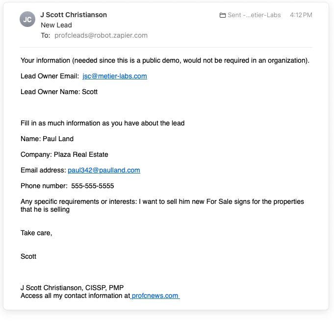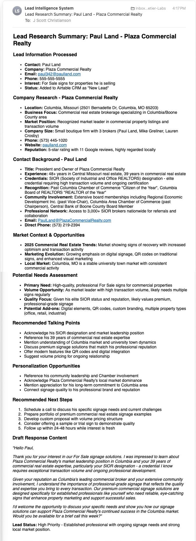 After multiple runs, several issues surfaced—some from my Zapier inexperience, others from the nature of LLMs, and a few from both. About half the time, the lead and lead-owner emails get swapped, so the reply goes to the lead—likely a Zapier design issue on my end. When a company name has a better-known twin (e.g., Delta Systems the manufacturer vs. a local software firm), the agent muddles the company’s mission. Both problems are fixable: give the LLM clearer instructions and include more context in the initial email.