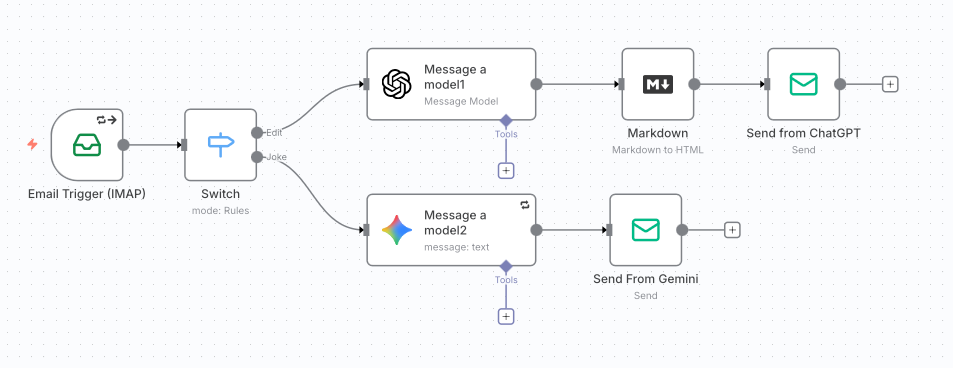 I wanted different actions to be performed by this agent based on the email subject, so I added an if module. Messages are routed to OpenAI/ChatGPT for editing when the subject is Edit and to a Google Gemini AI when the subject is Joke. I configured the “Message a model” nodes accordingly, then added the final steps to email the response back.
