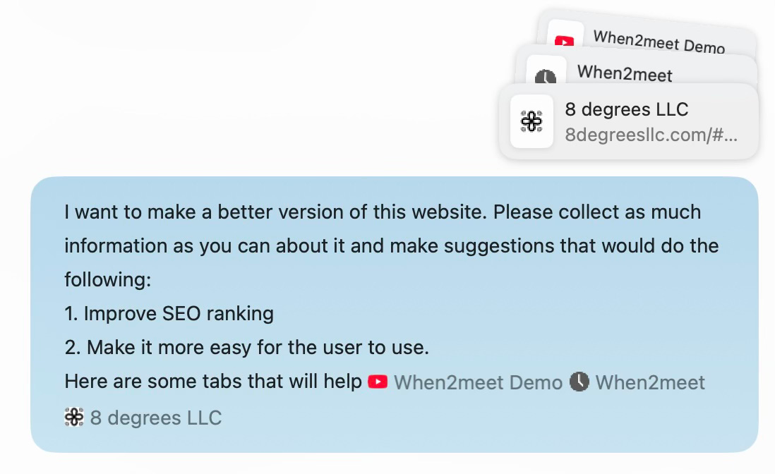 With an LLM built into the browser, you can open a site and ask Dia about it directly. You can even reference multiple open tabs in a single prompt. And yes—you can log in to sensitive systems and have it work with the data it finds there; if I were a security professional, I’d be more than a little alarmed by AI-enabled browsers! But I digress.