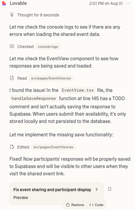 Here is sample exchange. I told Loveable’s chatbot: “When I share the event, the next person to pick dates doesn't see the first person's selections and the name in the participants list.” Here is its response.